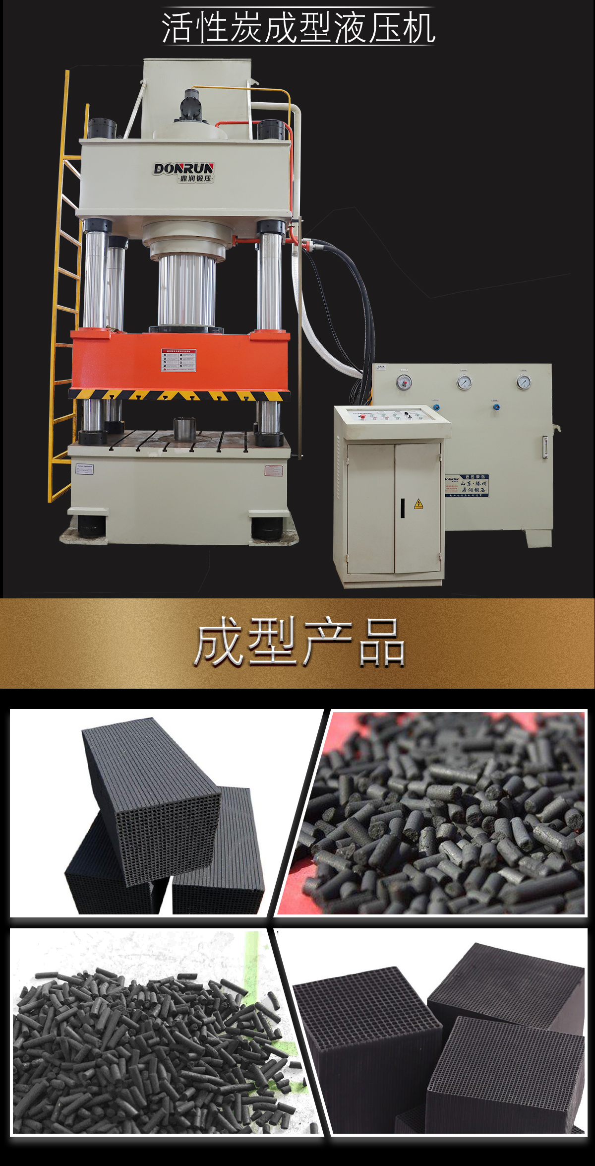 蜂窝活性炭成型液压机的结构特点:
