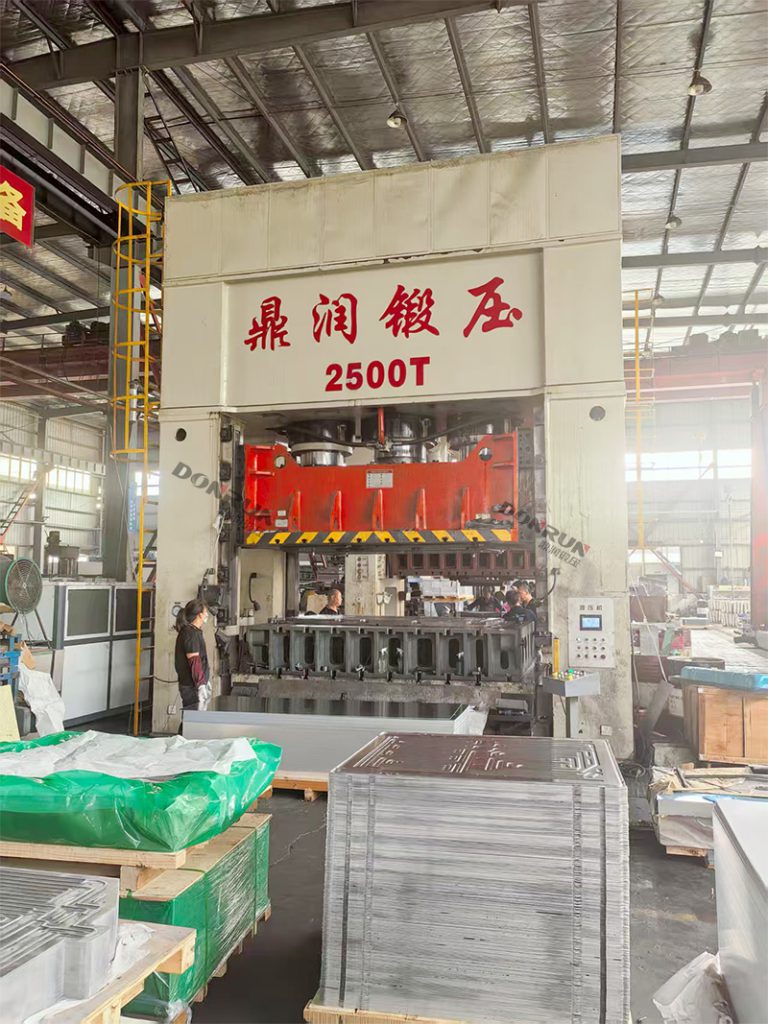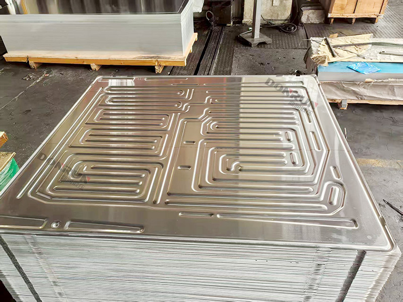 过程:原材料经过开卷、校平后,送入大型精密冲压机(2500吨框架液压机、3000吨框架液压机)。通过模具,一次进行拉延(形成基本形状)、切边、冲孔,以及最关键的流道成型。流道是通过模具在铝板上“挤”出凸起的通道,其形状、高度、分布需要精确控制。